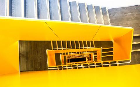 Aunque es difícil predecir dónde las personas deciden interactuar, la estrategia en este sentido se basó en proporcionar un número significativo de lugares donde los científicos pudieran encontrarse casualmente e iniciar conversaciones. Como todos deben moverse por el edificio, el sistema de circulación se convirtió en la opción obvia para ofrecer esos espacios. A lo largo de los corredores, se ubicaron áreas amuebladas con sillas y sofás que invitan a hacer un alto y socializar. La escalera principal, a la que llamaron ‘Hilo de Ariadna’, tiene la barandilla pintada de amarillo, y los descansos son más anchos de lo normal para permitir que los científicos se puedan quedar conversando ahí cuando se encuentren, sin interrumpir el tráfico.