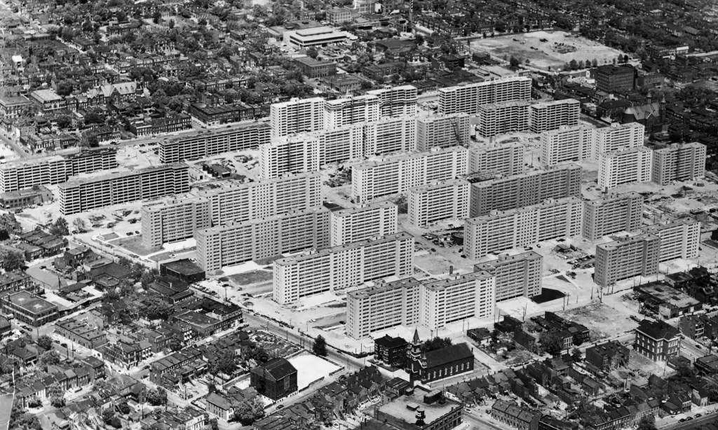Pruitt-Igoe fue un complejo de apartamentos que se inauguró entre 1954 y 1956, compuesto por 33 torres de 11 pisos. Aunque se tenían grandes expectativas sobre el proyecto, años después fue duramente criticado y catalogado como uno de los componentes de alienación social y de avivar la segregación racial entre las comunidades. Después de una década, el proyecto terminó convertido en un lugar ruinoso, habitado exclusivamente por residentes pobres y negros. En 1972, el complejo se sometería a una demolición completa de una forma tan espectacular que la implosión de las torres fue televisada.4