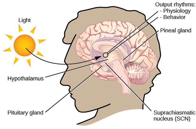 El hipotálamo es responsable de la secreción de una serie de hormonas que controlan aspectos de la autorregulación del cuerpo, como la temperatura, el sueño, el hambre y los ritmos circadianos. La exposición a la luz de la mañana azul/verde, provoca la liberación de la hormona cortisol que nos estimula y despierta, inhibiendo la liberación de la hormona llamada melatonina. Al anochecer, ocurre lo contrario, a medida que se reduce la cantidad de luz azul del sol, la melatonina se libera en el torrente sanguíneo y nos tornamos somnolientos.