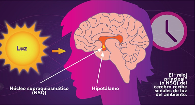 Cuando la luz penetra nuestros ojos, llega hasta la retina en donde las células fotorreceptoras transforman esta información en señales electroquímicas que son llevadas al cerebro. Estas células en la retina son: los conos, los bastones y una pequeña fracción de células ganglionares (RGC, en inglés), estas últimas no tienen mayor función en la visión. La información procesada por las células ganglionares es enviada al hipotálamo, al núcleo supraquiasmático (SCN, en inglés), que es el centro de nuestro reloj biológico.2