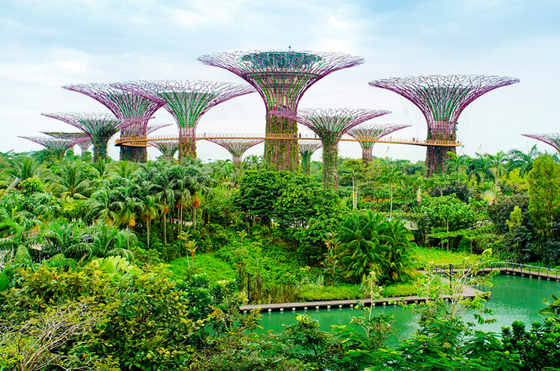 Gardens of the Bay es uno de los mejores ejemplos de cómo la bioconstrucción se abre paso tanto por su utilidad práctica como por su importante labor para atraer el turismo. Este parque público fue construido adyacente a una reserva marina y tiene una extensión de 100 hectáreas. Los superárboles que son la atracción central, son enormes construcciones de acero con recubrimiento de plantas en los laterales a los que se puede entrar libremente.