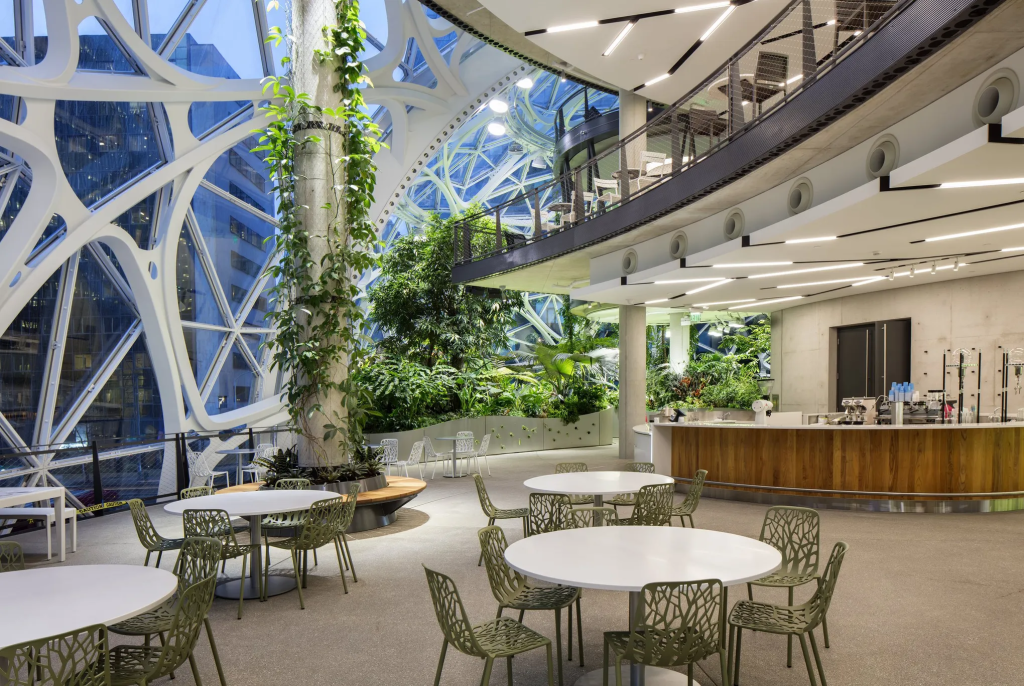 Las Esferas, del proyecto del Amazonas, pero sirven para atraer y congregar a la gente, ya que ofrecen una variedad de lugares para reunirse, trabajar y cenar, desde un “nido de pájaro” con listones de madera hasta terrazas con bancos y sillas.