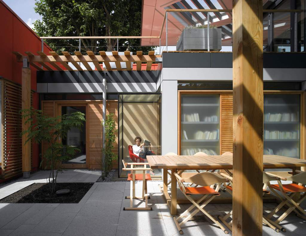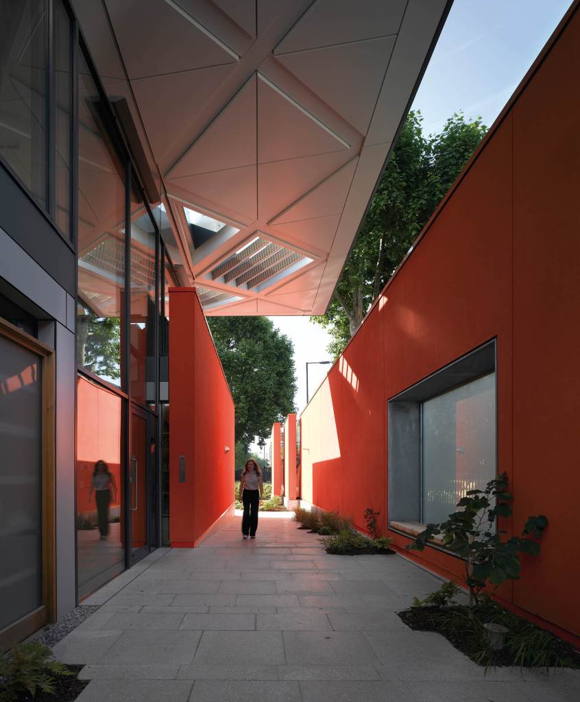 El techo está levantado sobre un clerestorio que permite la entrada de luz natural en el interior. El edificio tiene jardines externos e internos que los pacientes pueden disfrutar.