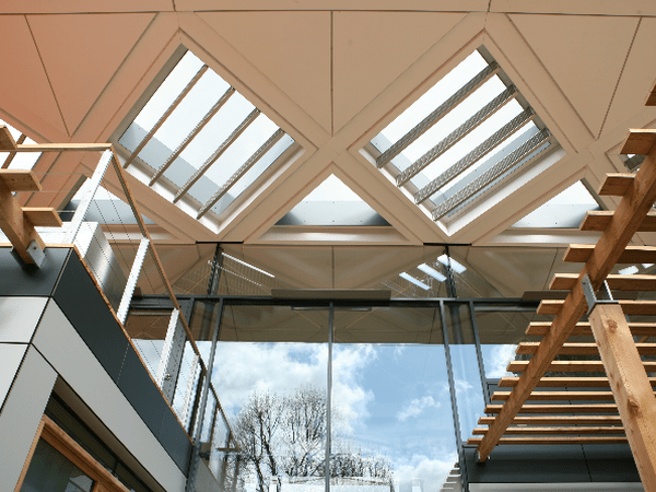 El edificio, de una sola planta y perfil bajo, tiene un entrepiso central iluminado por claraboyas triangulares, con vigas de madera que separan áreas internas y conectan visualmente con los jardines circundantes.