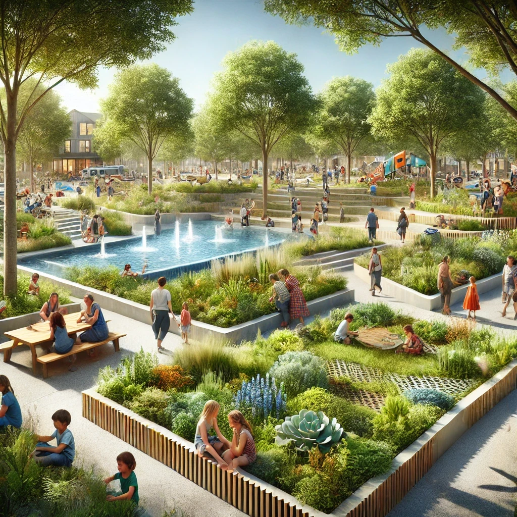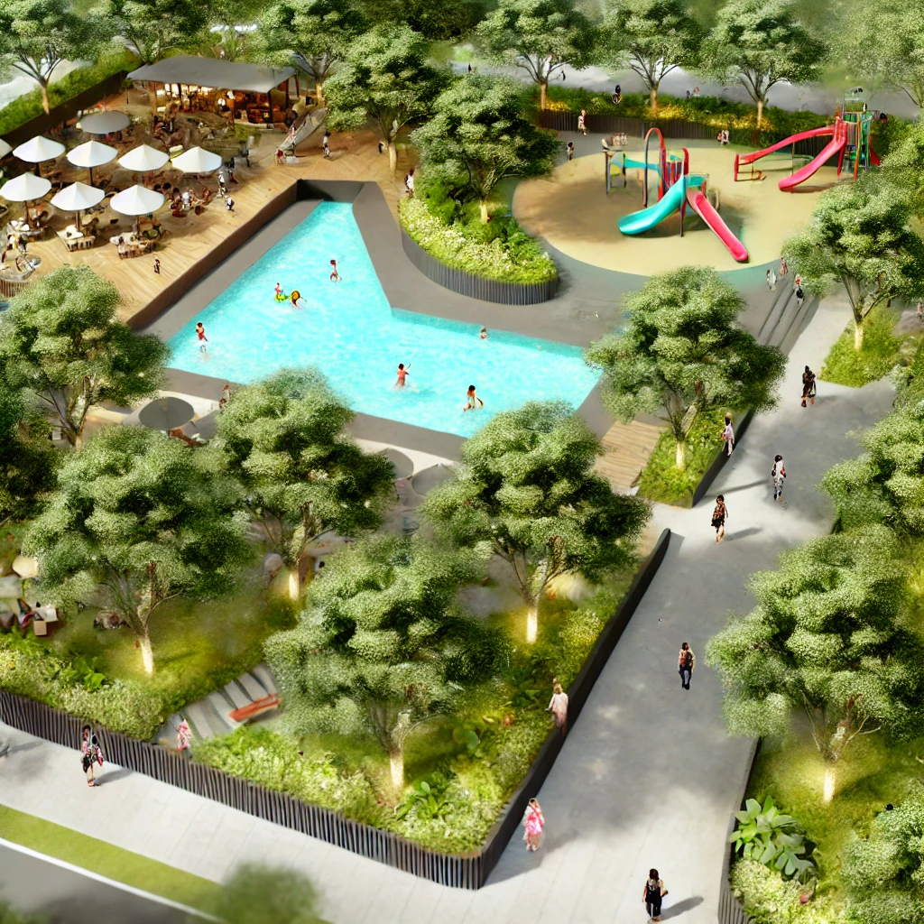 Incluyen elementos acuáticos como fuentes, una piscina para niños, grandes árboles, senderos, una cafetería y áreas de juegos. Todo se combina para crear un refugio urbano tranquilo y acogedor. (Imágenes creadas con IA)