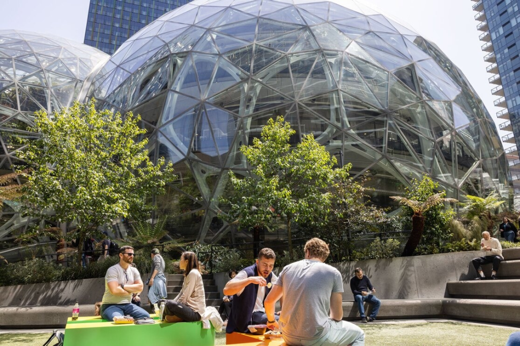 Está compuesta de un gran domo de cristal que encierra un gran jardín con áreas de servicios y áreas de trabajo.