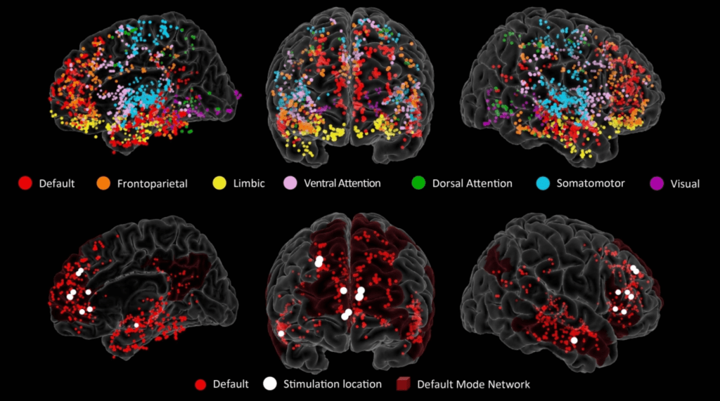 Research from the University of Utah highlights, in red on the lower images, the electrode placement locations. The upper images illustrate how various brain regions are activated during the creative process.
