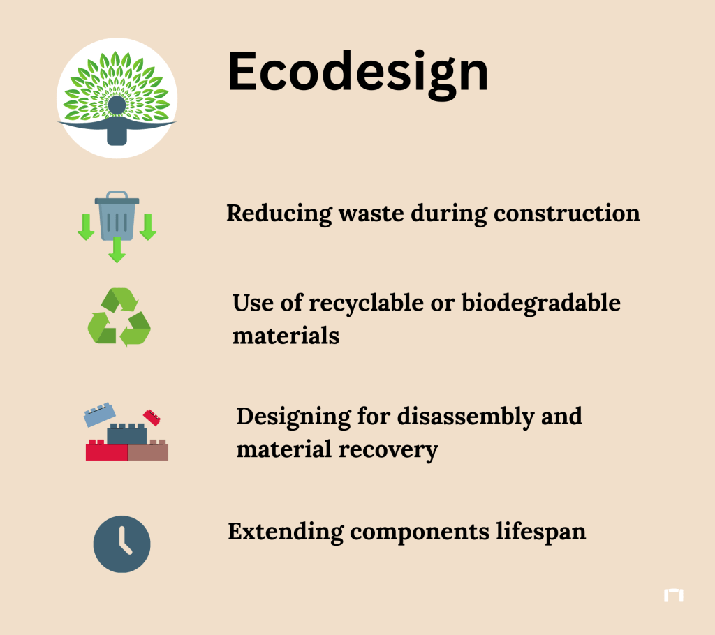 Eco-design (or ecological design) is more product-focused. It refers to the practice of designing objects, systems, or spaces with minimal environmental impact, taking into account their entire lifecycle. In architecture, this might involve: