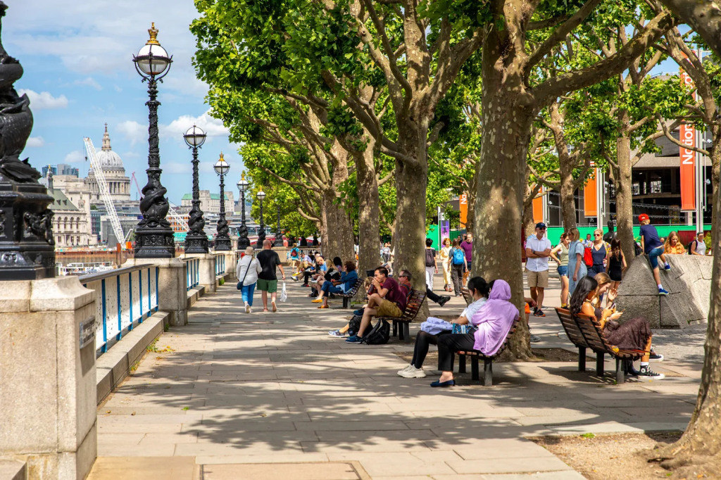 A vibrant riverside promenade in London, showcasing the interaction of people with nature and urban architecture, highlighting the importance of public spaces for mental well-being.