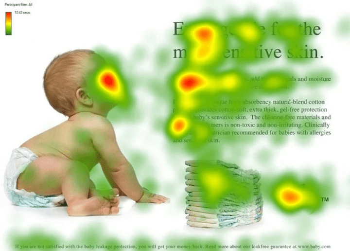 Right: The baby gazes at the text, and viewers follow that gaze—enhancing focus on the message. Humans instinctively follow where others look, a powerful insight for communication and design.