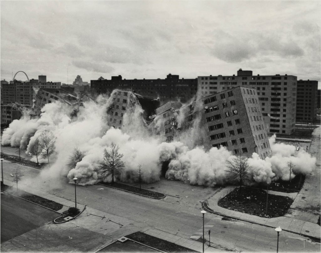 Estos proyectos masivos de “ingeniería social” terminaron siendo contraproducentes, desatando una ola de críticas no solo contra el Brutalismo, sino contra la arquitectura moderna en su conjunto. Un caso famoso fue Pruitt–Igoe en St. Louis, diseñado por Minoru Yamasaki y demolido en 1972; sus implosiones simbolizaron el colapso de la fe en el determinismo arquitectónico y marcaron un punto de inflexión en el pensamiento arquitectónico.